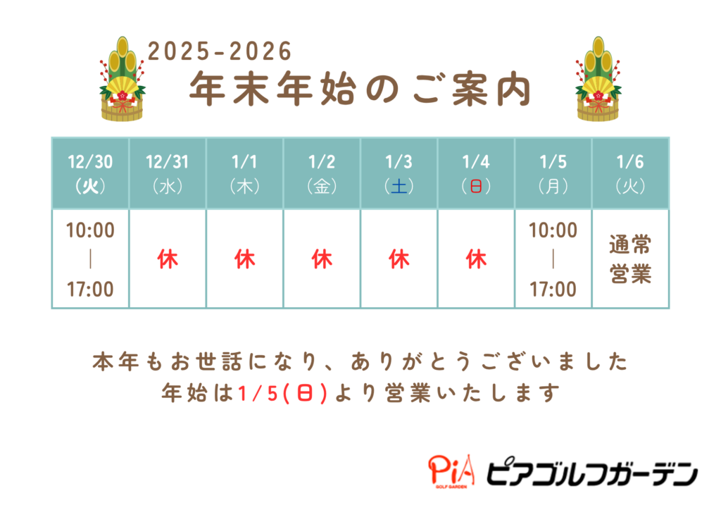 2025.12.10 年末年始の営業のお知らせ 日頃よりピアゴルフガーデンにご来場いただきまして、誠にありがとうございます。 年末年始の営業は下記の通りとなっております。 お間違えなきようご来場お待ちしております。 一覧へ戻る